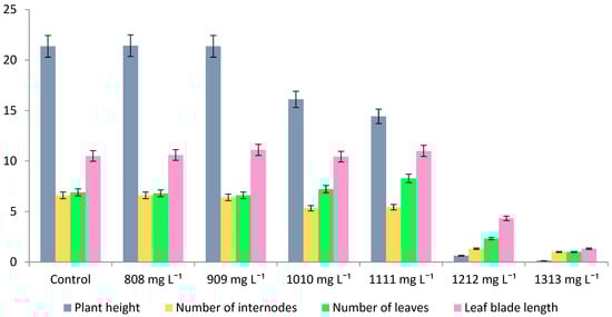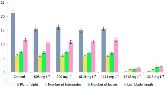 Buckwheat plants in the variants with zinc salt concentration of 1212–1313 mg L−1 restored their ability to root formation after subsequent microcloning in growth media MS (Figure 4). All morphological indicators of plants, such as their height, number of internodes, number of leaves, length of leaf blade, leaf color, were similar to those of the control variant.