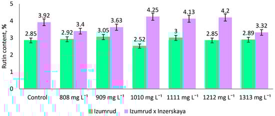 The plants, which are capable of adapting to stress factors, including the effects of heavy metals, are known to have the content of phenolic compounds, including flavonoids, in cells, which is reported to be significantly higher than those of the forms characterized by low viability and adaptive response [,]. In our studies, the highest rutin content (3.32–4.25%, average value 3.84%) was found in the hybrid Izumrud × Inzerskaya, which is 1.34 times as hight as that in the variety Izumrud (2.52–3.05%, average value 2.86%). The maximum amount of rutin, significantly exceeding the control, was recorded in the hybrid Izumrud × Inzerskaya in the variants after 1010–1212 mg L−1 of zinc salt 4.13–4.25% of rutin. It is interesting to note that the minimum accumulation of flavonoid was observed after exposure to the highest test concentration of 1313 mg L−1 zinc salt, which was 3.32%, which is 1.2 times as low as that in the control group. An increase of flavonoid rutin biosynthesis in buckwheat (1.25-time higher compared with the control group) under the effect of elevated zinc salt concentration (404 mg L−1) in vitro was demonstrated in our earlier works [].