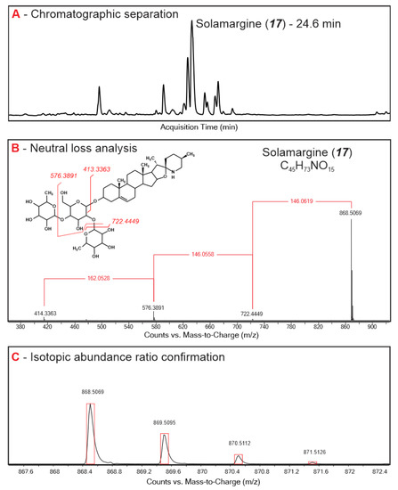 HPLC TOF MS chromatograms were processed in MassHunter B.08.00 Agilent Profinder software (Agilent Technologies Inc, Santa Clara, CA, USA). The assignment of glycoalkaloids was performed based on neutral loss analysis using fragmentation and isotopic patterns for each compound [16,35]. Neutral loss corresponding to mono-, di-, tri-, and tetrameric sugar moieties that could be obtained by combining pentose, hexose, and deoxyhexose units were considered to be with the error of less than 3 ppm.