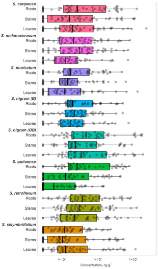 The glycoalkaloid concentrations, quantified based on the solamargine standard, were in the range of 7–5.63×105 ng g−1 (DW basis) (Figure 2). For most of the plants, the median glycoalkaloid concentration was similar for shoots and roots; however, the distribution of specific glycoalkaloid concentrations differed (Figure 2). For example, the S. sisymbriifolium median for glycoalkaloid concentrations was higher for shoots than for roots. The glycoalkaloid concentration in roots clustered close to the median, while in shoots, an additional cluster in the third quartile was observed. This is consistent with the lower total glycoalkaloid content for S. sisymbriifolium roots. Most of the S. caripense, S. quitoense, and S. sisymbriifolium glycoalkaloids concentrations were close to the median and third quartiles (Figure 2). The higher concentrations accounted for 97–98% of the total glycoalkaloid content, represented by 7–17 individual glycoalkaloids. The median for S. quitoense shoots was lower than for roots due to a large number of glycoalkaloids with low concentrations resulting in a longer plot. This is also reflected in the skewed data and relatively low first-quartile value. For the S. quitoense roots, an opposite trend was observed, with the majority of the glycoalkaloids having concentrations above the median value and relatively evenly distributed third and fourth quartiles.