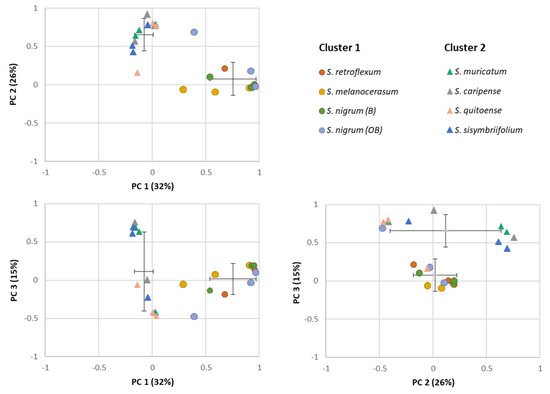 The similarities among the Solanum plants’ shoot and root extracts were assessed via PCA based on the composition and abundance of individual glycoalkaloids (Figure 3). Total variance (73%) was explained by first three principal components, with PC1, PC2, and PC3 accounting for 32, 26, and 15%, respectively. Based on the PCA loading plot, a separation of extracts on two clusters was observed: Cluster 1 included S. melanocerasum, S. nigrum, and S. retroflexum, and Cluster 2 included S. caripense, S. muricatum, S. quitoense, and S. sisymbriifolium. For the Cluster 1 plants (S. melanocerasum, S. nigrum, and S. retroflexum), the primary glycoalkaloids present in all plants were 15, 17, 20, 28, and 46. In the Cluster 2 plants, three predominant compounds (16, 17, and 26) that belong to solanidine-type glycoalkaloids were present across all the species [19,34]. The clustering is consistent with the fact that S. nigrum, S. retroflexum, and S. melanocerasum belong to the Morelloid clade and have been shown to be genetically related based on morphological and molecular data [40,41]. Cluster 2 plants do not belong to the same clade. However, S. muricatum has been shown to be related to wild-species S. caripense, and thus can share a similar glycoalkaloid composition [42]. The basis of its relationship to other Cluster 2 plants is not clear, as S. quitoense belongs to the Lasiocarpa clade and S. sisymbriifolium appears to be closely related to the Androceras/Crinitum clade [43,44]. While the clustering of Solanum plants based on the composition of their secondary metabolites profiles has been previously used for the chemotaxonomy of Solanum plants, to the best of our knowledge, the use of glycoalkaloids for Solanum biological activity clustering has not been investigated yet for the selected Solanum species [45].