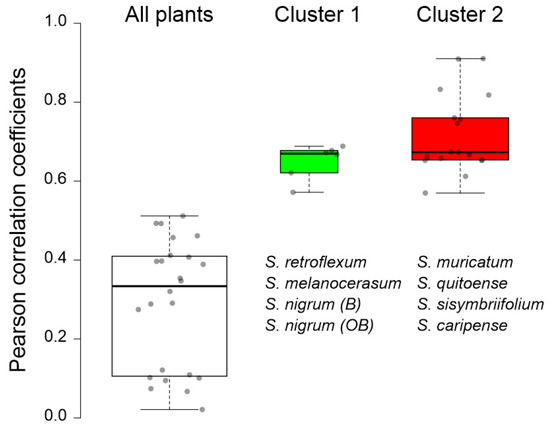 To confirm the observed clustering of Solanum plants based on their glycoalkaloid content, the Pearson’s correlations of the glycoalkaloid distributions in the shoots and roots were analyzed (Table 2). Strong correlation coefficients within the two clusters signify the applicability of glycoalkaloids as a chemical class for relating the species to the Solanum family. Specifically, the correlation coefficients for the Cluster 1 plants (S. melanocerasum, S. nigrum, and S. retroflexum) leaf glycoalkaloids ranged from 0.853 *** to 0.994 ***. For the Cluster 2 plants (S. caripense, S. muricatum, S. quitoense, and S. sisymbriifolium), the association amongst the glycoalkaloids in leaves was also strong, with coefficients ranging from 0.534 *** to 0.992 ***. Similarly, the association among root glycoalkaloids in the studied Solanum plants was present, though weaker, for the two identified clusters, with correlation coefficients ranging from 0.124 to 0.524 *** for Cluster 1 and from 0.037 to 0.966 *** for Cluster 2. A heat map analysis of the glycoalkaloids contributing to the Solanum species corroborate the presence of two distinct clusters (Figure 4).