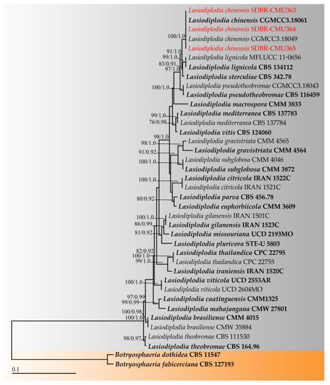 Pure cultures were isolated from a single conidial isolation. Three fungal isolates, CMU363, CMU364, and CMU365, which were of a similar morphology were obtained and deposited in the Culture Collection of Sustainable Development of Biological Resources Laboratory, Faculty of Science, Chiang Mai University (SDBR-CMU), Chiang Mai Province, Thailand, under the accession numbers SDBR-CMU363, SDBR-CMU364, and SDBR-CMU365, respectively. Fungal colonies on PDA were 85−90 mm in diameter and initially white with fluffy aerial mycelia. The fungal colonies then became pale olivaceous grey to olivaceous grey, while the reverse side became olivaceous grey to olivaceous black after three days of incubation at 30 °C (Figure 1i–k). Conidiomata, paraphyses, conidiophores, conidiogenous cells, and conidia were observed on PDA after two weeks of incubation at 30 °C. These characteristics matched the above-mentioned descriptions. Thus, all isolated fungi were initially identified as belonging to the genus Lasiodiplodia. Fungal identification was then further confirmed using multi-gene phylogenetic analyses.