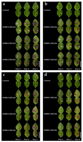 Pathogenicity test using L. chinensis SDBR-CMU363, SDBR-CMU364, and SDBR-CMU365 on kaffir lime leaves after inoculation by mycelial plug (a,b) and conidial suspension (c,d). The experiments of wounded (a,c) and unwounded (b,d) leaves. Scale bars = 50 mm.