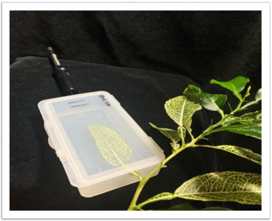 Released VOCs were collected from intact plant leaves using SPME and were analyzed by GC-MS. The SPME fiber was a mixed polarity fiber (#57328U, Supelco, Bellefonte, PA, USA), as previously reported for the in vivo collection of citrus leaf volatiles [10,18]. This SPME fiber was chosen for its capacity to trap a broad range of volatile compounds [18]. The collection device was modified from that previously reported to allow for VOC collection from the leaf in a more natural position (Figure 5). Each leaf was placed lying flat (adaxial epidermis up) inside a clear plastic clamshell box about the size of a cassette tape holder (120 mm long × 75 mm wide × 10 mm deep) with a notch cut out at one end for the stem and a pinhole at the other end for fiber entry. After the box was closed around the leaf, it was sealed carefully with a strip of Parafilm® M. As previously reported, we collected the released volatiles at 27 °C for 2 h from the static headspace above each enclosed leaf.