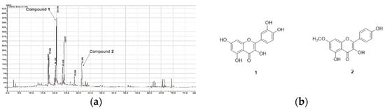 High Pressure Liquid Chromatography (HPLC) of an ethanol extract of T. loureiri (ETL) and chemical structures of two ETL compounds. (a) HPLC chromatogram (at 330 nm) of ETL. (b) Structures of quercetin (1) and rhamnocitrin (2).