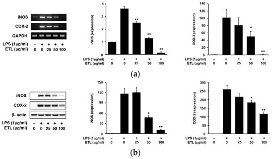Effect of ETL on the mRNA and protein expression of iNOS and COX-2 in LPS-stimulated RAW264.7 cells. The cells were pre-treated with ETL (25–100 μg/mL) for 1 h, followed by LPS (1 μg/mL) treatment for 24 h (the untreated control/LPS(-), the LPS-treated group/LPS(+)). (a) mRNA expression of iNOS and COX-2, as evaluated by RT-PCR analysis. Glyceraldehyde 3-phosphate dehydrogenase (GAPDH) was used as the internal control. (b) Protein expression of iNOS and COX-2, as determined by Western blot analysis. β-actin was used as the internal control. Data are expressed as the mean ± SD of three replicates; * p < 0.05 and ** p < 0.01, compared to the LPS-treated cells.