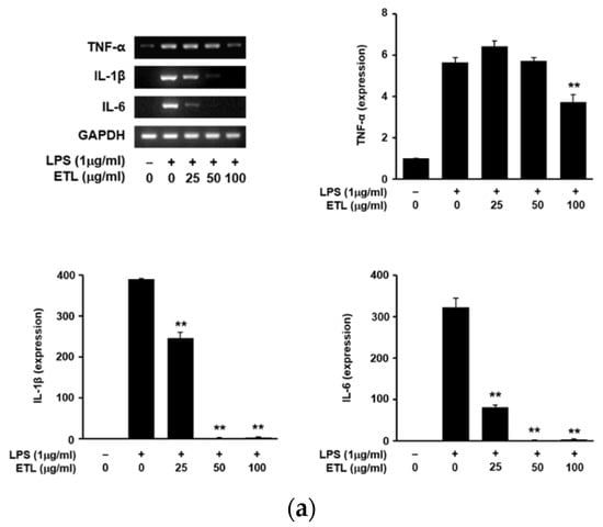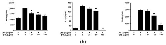 Effect of ETL on the expression of TNF-α, IL-1β, and IL-6 in LPS-stimulated RAW264.7 cells. Cells were pre-treated with ETL (25–100 μg/mL) for 1 h, followed by LPS (1 μg/mL) treatment for 24 h (the untreated control/LPS(-), the LPS-treated group/LPS(+)). (a) mRNA expression of TNF-α, IL-1β, and IL-6, as analyzed by RT-PCR. (b) Pro-inflammatory cytokine levels in the cell culture supernatant, determined using ELISA. Data are expressed as the mean ± SD of three replicates; * p < 0.05 and ** p < 0.01, compared to the LPS-treated cells.