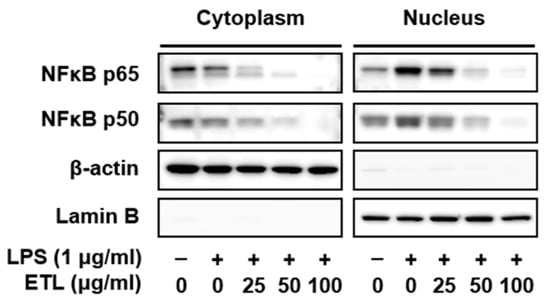 NF-κB is a transcription factor involved in various pathways like cytokine response, inflammation, and cell growth regulation. It has been reported to be involved in promoting the production of major pro-inflammatory factors like TNF-α, IL-1β, and IL-6 [21,22]. Upon activation, NF-κB activates the genes of various inflammation-associated targets like iNOS, COX-2, TNF-α, IL-1β, and IL-6 in LPS-stimulated cells [23]. To verify the involvement of ETL in the NF-κB pathway, we investigated the nuclear translocation of NF-κB (p65 and p50) from the cytosol, in LPS-stimulated RAW264.7 macrophages, using Western blot analysis. As shown in Figure 6, ETL markedly reduced the LPS-induced nuclear translocation of NF-κB (p65 and p50). In this experiment, β-actin was used as the cytoplasmic control and lamin B was used as the nuclear control. Our findings suggest that ETL inhibits the NF-κB signaling pathway by blocking the LPS-induced nuclear translocation of the p65 and p50 subunits.