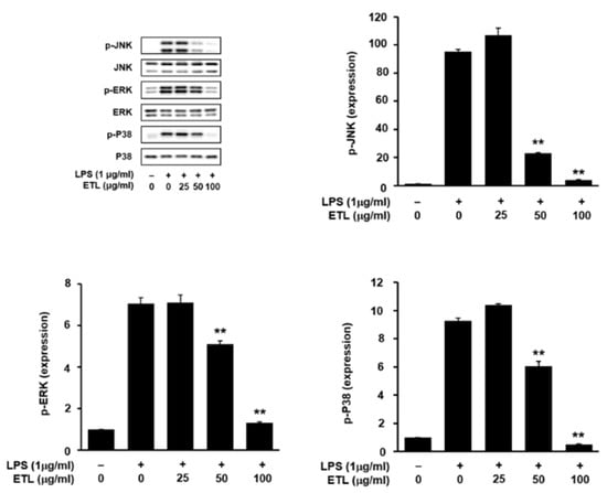 Effect of ETL on the phosphorylation of JNK, ERK, and p38 in LPS-stimulated RAW264.7 cells. The cells were pre-treated with ETL (25–100 μg/mL) for 1 h and then treated with LPS (1 μg/mL) for 30 min (the untreated control/LPS(-), the LPS-treated group/LPS(+)). The cell lysates were subjected to Western blot analysis using anti-phospho-JNK, anti-JNK, anti-phospho-ERK, anti-ERK, anti-phospho-p38, and anti-p38 antibodies. The results shown are representative of at least three independent experiments; ** p < 0.01, compared to the LPS-treated cells.