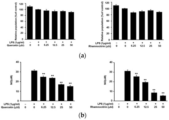 Effect of quercetin and rhamnocitrin on cell viability and NO production in LPS-stimulated RAW264.7 cells. The cells were pre-treated with quercetin and rhamnocitrin (6.25–50 μM total) for for 1 h, followed by LPS (1 μg/mL) treatment for 24 h (the untreated control/LPS(-), the LPS-treated group/LPS(+)). (a) Cell viability, as determined by MTT assay. (b) NO production in the cell culture supernatant, as measured using Griess reagent. Data are expressed as the mean ± SD of three replicates; ** p < 0.01, compared to the LPS-treated cells.
