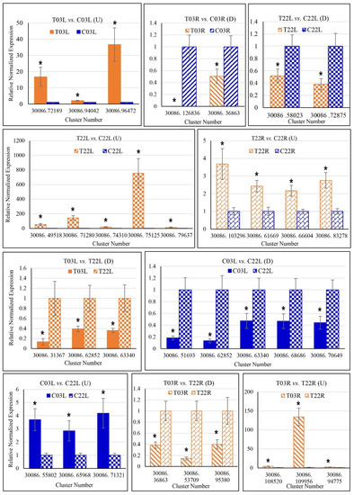 qRT-PCR validation of gene expression observed through RNA-Seq analysis. The y-axis indicates relative normalized expression, and the x-axis indicates cluster number (gene IDs). Graphs for upregulated (U) and downregulated (D) genes are shown separately. An asterisk (*) indicates a significant difference (t-test at p ≤ 0.05). T03L, Treatment ‘03’ Leaf; C03L, Control ‘03’ Leaf; T22L, Treatment ‘22’ Leaf; C22L, Control ‘22’ Leaf; T22R, Treatment ‘22’ Root; C22R, Control ‘22’ Root, T03R, treatment ‘03’ Root, and C03R, Control ‘03’ Root.