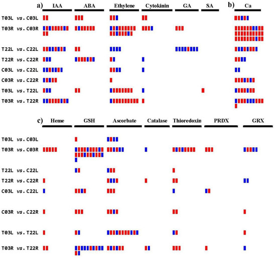 In treatment vs. control comparisons, 5, 49, 6, and 10 DEGs associated with redox signaling were identified in T03L vs. C03L, T03R vs. C03R, T22L vs. C22L, and T22R vs. C22R, respectively. In salt-tolerant vs. salt-sensitive comparisons, 11, 11, 17, and 27 DEGs related to redox signaling were identified in C03L vs. C22L, C03R vs. C22R, T03L vs. T22L, and T03R vs. T22R, respectively. Our analysis revealed the highest number of DEGs was associated with GSH, followed by ascorbate and thioredoxin (Figure 3c and Table S10).