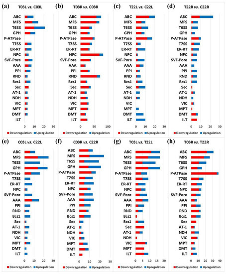Transporter analysis of DEGs. The y-axis indicates transporter superfamilies. The x-axis shows gene counts. Salt treatment vs. control comparisons are shown in the top four panels (a–d). Salt-tolerant vs. salt-sensitive comparisons are shown in the bottom panels (e–h). The red color indicates downregulated DEGs, and the blue indicates upregulated DEGs. Compared samples are indicated at the top of each panel.