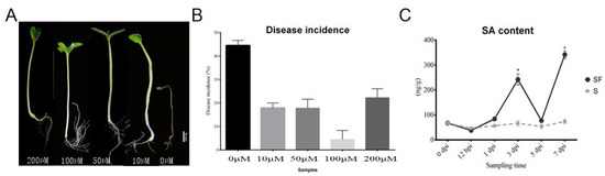 The pot experiment was conducted in the city of Changsha (112°58′42″ E, 28°11′49″ N), Hunan Province, China. The soil was sandy loam with background sterilization (LDZM-80KCS-3 vertical pressure steam sterilizer, ZHONGAN, Shanghai, China) before use [3]. The trial watermelon variety was Zaojia 8424 (Xinjiang Farmer Seed Technology Co., Ltd., Urumqi, China), which is the main cultivated variety on the Chinese market. The watermelon seedling nutrition bowl was cultivated and grown in a biochemical incubator (LRH-300, ZHUJIANG, Taihong, Shaoguan, China) at Tm 25 °C, light 16 h/Tm 18 °C, dark 8 h. The nutrition bowl seedling substrate included peat, perlite, and vermiculite (6:3:1). We transplanted each plant into pots separately after 30 days. One experiment concerned a study of the effect of exogenous SA on watermelon Fusarium disease resistance, and screening of the optimal concentration of SA to improve watermelon seedling growth. The 5 mL exogenous SA (Sigma-Aldrich LLC., Merck KGaA, Darmstadt, Germany), with a gradient of 0 μM, 10 μM, 50 μM, 100 μM, and 200 μM, was incorporated into the root zone of each plant, and 5 mL was added again 24 h later. Two days after the watermelon seedlings reached the stage of possessing two leaves per plant, 5 mL aliquots of 106 conidia/mL FON were added into the root zone of each plant [2]. Thereafter, the phenotypes of the watermelon seedling were compared, and disease incidences at 7 dpi (7 days postinoculation) were recorded. Moreover, in order to identify the effect of SA content after FON incubation, 5 mL aliquots of 106 conidia/mL FON were incorporated into the root zone of each watermelon plant when they possessed two leaves per plant, and watermelon root samples were collected at different sampling times. Samples were referred to as S: control (Zaojia 8424, sensitive cultivar); and SF (Zaojia 8424, sensitive cultivar +FON). Moreover, we used 0 dpi (before treatment); 12 hpi (12 h postinoculation); 1 dpi (1 day post inoculation); 3 dpi (3 days postinoculation); 5 dpi (5 days postinoculation); and 7 dpi (7 days postinoculation). We selected 15 watermelon plants as one repetition, and set three independent replicates for each sample group.