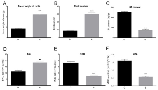Furthermore, the watermelon seedling morphology showed that the plants were much healthier and had more leaves and roots under rotation, as compared with those from the monocropping growth condition group (Figure 2A,B). Samples were referred to as C (continuous watermelon monocropping) and R (oilseed rape rotation cropping). The disease incidence results indicated that the incidence of watermelon Fusarium wilt in the rotated cropping system was significantly lower than that in the continuous cropping system group (Figure 2C). Moreover, the quantitative detection of FON in rhizosphere soil using real-time PCR [3,26] indicated that the abundance of FON exhibited no significant differences between these two systems (Figure 2D). This result suggested that there might be other reasons that led to plants being healthier in the rotated system, such as the structure of rhizosphere soil community [3,6,7]. The results from plant physiological indexes showed that the fresh root weight, root number, and root morphology were significantly affected. The fresh root weights (Figure 3A) in the R group were nearly twice those of the C group, and the pattern was the same for root number (Figure 3B). In addition, the results showed that there was a significant enhancement of the phenylalanine ammonia-lyase (PAL) enzyme activity (Figure 3D), but a decrease in peroxidase (POD) enzyme activity (Figure 3E) and malondialdehyde (MDA) content (Figure 3F) in the R group as compared with the C group. Therefore, these results showed that the plants under rotation (R) were healthier than those under the continuous cropping system (C). More importantly, our study showed a significantly higher SA content in the C group as compared to the R group, which confirmed that a higher level of SA was harmful to the plants (Figure 3C). Therefore, we aimed to further explore the different gene expression patterns related to SA pathways in watermelon roots that might be responsible for Fusarium wilt resistance under different cultivation systems.