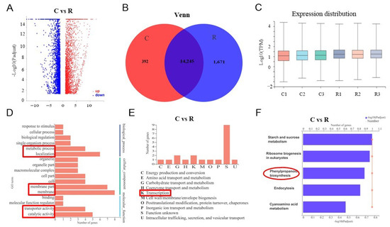 Transcriptome comparison analysis of watermelon gene expression under different cropping systems: (A) volcano map with different expressions; (B) Venn diagram of watermelon genes expression under different cropping systems; (C) box plot of gene expression distribution; (D) GO annotations analysis; (E) COG classification; (F) comparison analysis of major KEGG pathway enrichment. C: continuous watermelon monocropping; R: oilseed rape rotation cropping. Three biological replicates per samples were analyzed.
