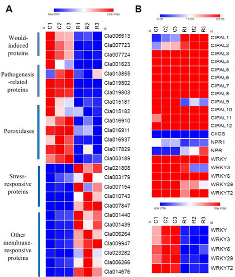 Differential expression genes in watermelon roots under different cropping systems: (A) comparison analysis of the expression of 26 genes under different cropping systems; (B) comparison analysis of the relative expression of 20 candidate genes in SA biosynthesis. The relative color scheme uses selected values in each row to convert values to colors. C: continuous watermelon monocropping; R: oilseed rape rotation cropping. Three biological replicates per samples were analyzed.