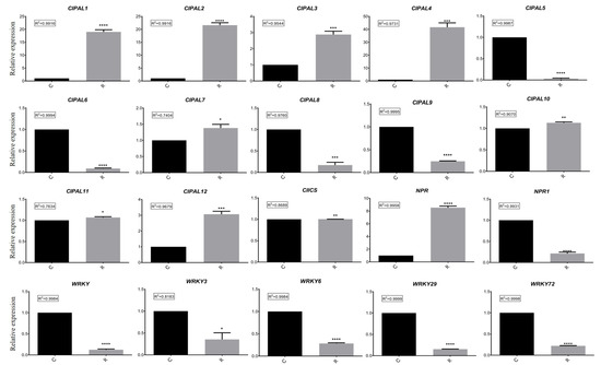 In order to further test the hypotheses concerning the different expressed genes related to SA biosynthesis in watermelon roots under different growth conditions, we examined the results of the RT-qPCR analysis. These data confirmed significant differences in the expressions of the CIPALs, NPR, and NPR1 genes (Figure 6). The results emphasized the important role of the CIPAL1, CIPAL9, and CIPAL12 genes in SA biosynthesis. NPR expression was significantly higher in group R, while NPR1 expression was higher in group C, suggesting that they may have different functions under different growth conditions.