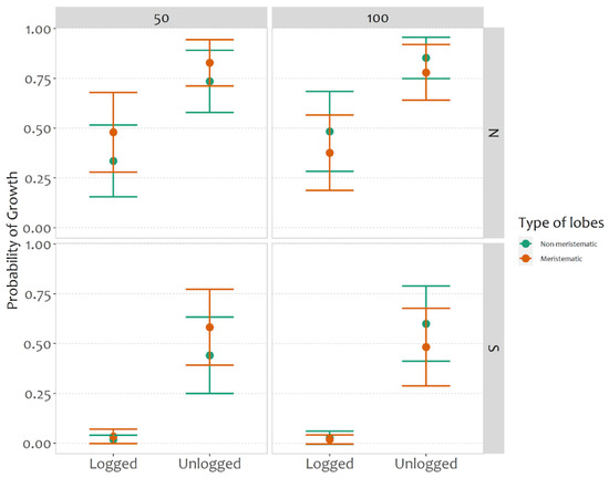 Predicted probability of growth for forest types (logged and unlogged), type of lobes (non-meristematic and meristematic), aspect (N = north, S = south) and different heights from the ground (50 and 100 cm).