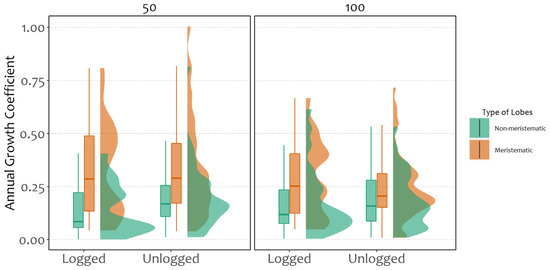 Annual growth coefficient for forest type (logged and unlogged), type of lobes (non-meristematic and meristematic) and different heights from the ground (50 and 100 cm).