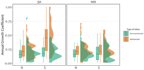 Annual growth coefficient in the unlogged stand according to type of lobes (meristematic and non-meristematic), aspect and different heights from the ground (50 and 100 cm).