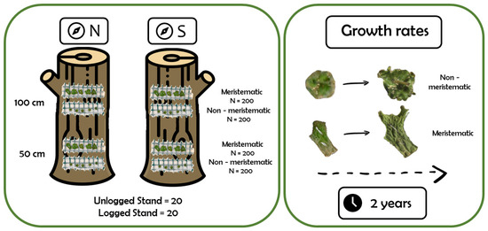 According to the methodology described in [20], healthy L. pulmonaria thalli were randomly selected from a nearby oak forest to obtain 400 meristematic fragments and 400 non-meristematic fragments (Figure 4). Specifically, the first were upward-growing young lobes with intact apical meristems, and the latter were fragments of the inner sorediate or non-sorediate parts of the thallus, lacking apical growth [46]. The source habitat for collected fragments had the same characteristics as the unlogged stand, being adjacent to the study sites and extending onto a hillside with a northern slope, where Q. cerris, Q. ilex and Q. pubescens were the most common trees colonized by L. pulmonaria [20]. In order to minimize the harvesting of material from the native population, all fragments were smaller than 1 cm. Overall, 800 fragments of L. pulmonaria were transplanted for two years (from March 2019 to March 2021). Thallus fragments (each representing a statistical sample) were exposed on the northern and the southern sides of the trunks of twenty randomly selected Turkey oaks (Q. cerris) (reciprocal distance >10 m), at about 100 cm and 50 cm from the ground, half in the logged and half in the unlogged stand: 400 meristematic and 400 non-meristematic fragments in each forest type (logged and unlogged stands). Lobaria pulmonaria was exposed using a specific transplant device, a ‘barella’, which was composed of a sterilized bandage supported by a plastic net (10 × 2 cm2). For each device, for practical reasons, five meristematic or five non-meristematic fragments of thalli were tied onto the bandage to avoid overlapping with each other [20].