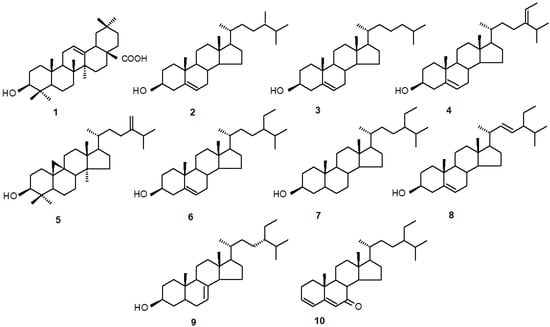 The structures of triterpenoid (oleanolic acid) and steroids identified in Calendula officinalis hairy roots. (1) oleanolic acid; (2) campesterol; (3) cholesterol; (4) isofucosterol; (5) 24-methylenecycloartanol; (6) sitosterol; (7) sitostanol; (8) stigmasterol; (9) stigmast-7-en-3-ol; (10) tremulone.