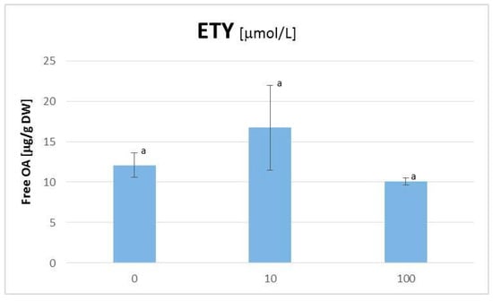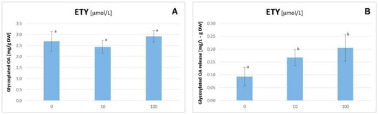 The elicitation with ETY, applied in the form of ethephon as an ETY-generating agent, did not influence significantly the C. officinalis hairy root growth; i.e., neither fresh mass nor dry weight was changed in a statistically significant manner (Figures S1 and S2). Likewise, the influence of the ETY treatment on triterpenoid metabolism was also rather slight; free OA accumulation in hairy root tissue was moderately increased at the concentration of 10 μM ETY and decreased at the concentration of 100 μM ETY (however, the results were not statistically significant according to the considerable scattering of results; Figure 2).The latter effect was accompanied by more than two-fold increase of saponin release to the medium (the results were statistically significant; Figure 3B). Simultaneously, ETY had practically no influence on the synthesis and accumulation of OA glycosides in hairy root tissue (Figure 3A).