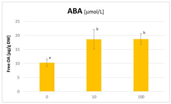 The applied concentrations of ABA influenced the hairy root growth slightly negatively; both the fresh mass and the dry weight were decreased by approx. 30% at a concentration of 10 μmol/L (Figures S3 and S4). Simultaneously, elicitation with ABA exerted a 1.8-fold increase (statistically significant) of the content of free OA the hairy root tissue (Figure 4), whereas no enhanced accumulation of saponins was observed (Figure 5A). Instead, the intensive release of these compounds to the medium was noticed; it increased 4.4- and 6.6-fold as compared to the control at concentrations of 10 and 100 µmol/L ABA, respectively (all obtained results were statistically significant; Figure 5B).