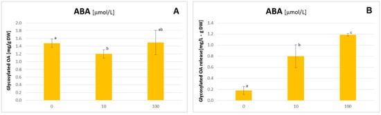The content of oleanolic acid in the form of glycosides accumulated in hairy roots (A) and released to the medium (B) after elicitation with abscisic acid. Bars which do not share a common letter are significantly different (p < 0.05).