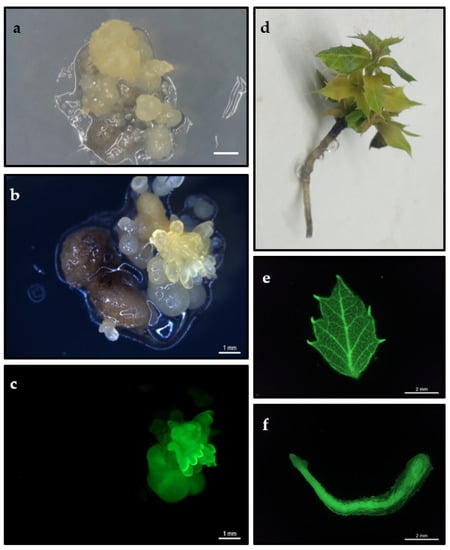 The selection efficiency was relatively high in the present study, especially in line E2. The results validate GFP fluorescence as an effective, precise and non-destructive marker for detecting transgenic somatic embryos in holm oak. Moreover, a strong GFP fluorescence signal was detected in holm oak somatic embryos and in different tissues derived from transgenic plants. Double selection via antibiotic resistance and expression of a GFP gene has also been successfully applied in other recalcitrant species, improving the selection process and reducing the escape number, selection time and antibiotic concentration [42,44].