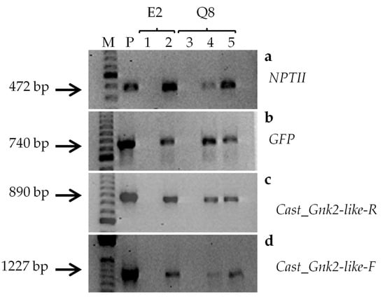 Screening of transgenic embryos by PCR. The presence of transgenes was determined by PCR screening using the primer pairs specific to (a) NPTII (472 bp), (b) GFP (740 bp), (c) Cast_Gnk2-like-R fragment (890 bp) and (d) Cast_Gnk2-like-F fragment (1227 bp). M DNA ladder; P corresponds to plasmid DNA (positive control); Lanes 1–2: E2 amplification corresponding non-transformed (1) and transformed (2) lines; Lanes 3–5: Q8 amplification corresponding non-transformed (3) and transformed (4, 5) lines.