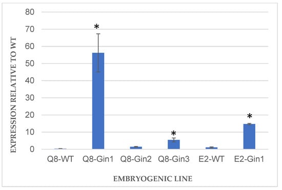 Expression analysis of Cast_Gnk2-like gene in somatic embryos of holm oak. Expression in transformed lines was calculated relative to the respective non-transgenic lines (WT), and normalized to EF1α and TUB reference genes. Bars are mean ± standard error (n = 3). Asterisks indicate significant differences in the expression when compared to WT with p < 0.05 (t-test).