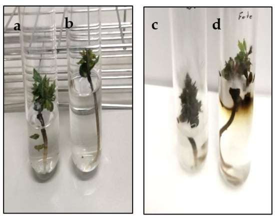 Morphological appearance and progress of infection with P. cinnamomi in a non-transformed plantlet (a,c) and transformed plantlet (b,d) of genotype Q8 immediately after inoculation (a,b) and 7 days later (c,d).