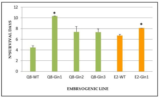 Survival ability of transformed and non-transformed (WT) holm oak plants derived from genotypes Q8 and E2 after 15 days of infection with P. cinnamomi. Bars are mean ± standard error (n = 3). Asterisks indicate significant differences in the survival when compared to WT with p < 0.05 (Tukey’s HSD test).