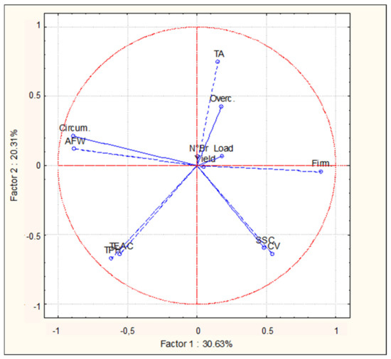 All the productive, qualitative, and nutritional parameters were analyzed using the multivariate test analysis of variance (ANOVA), to determinate differences among different years, branch number, crop load, cultivars, and their interactions. Significant differences within samples were calculated according to Fisher tests (Least Significant Difference, LSD). Principal component analysis (PCA) was also used to evaluate the levels of association among the productive, qualitative, and nutritional parameters, and among the variables “cultivars”, “crop load”, and “n° of branches”. In the graph, the parameters and the variables that are closest to each other in the same geometric plane of the bi-plot are considered to be interrelated, and consequently the parameters and the genotypes that are distant from each other are not related or are negatively related. The greater the distance of a vector from the origin of the axis, the higher the correlation of the variable with the PC represented in that axis. All analyses were performed using the software STATISTICA 7.0 (StatSoft. Tulsa, OK, USA). Differences were considered significant for p ≤ 0.05.