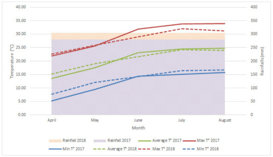The study was carried out in a commercial peach orchard planted in 2014, in Marche Region, Italy (43.012344N, 13.362602E). The experiment was conducted over two years (2017 and 2018), in an orchard positioned in a valley floor area. In the April–August period of 2017 and 2018 seasons, temperatures and rainfall were measured with a weather station (iMetos-Pessl Instruments, Weiz, Austria) (Figure 2). Temperature ranges from 5.3 to 33.9 °C, and average rainfall was 279.6 and 304.4 mm in the 2017 and 2018 seasons, respectively. The research was carried out on four flat peach cultivars, with white flesh (Galaxy, Platibelle, Plane® Delicious and Plane® Star), with different bloom and harvest periods, grafted on Garnem® rootstock, and spaced 5 × 3 m. The ‘Catalonian vase’ training system was applied for all trees (Figure 3). All the agronomic practices applied to the orchard followed the integrated production specification of the Marche Region (https://www.regione.marche.it/Portals/0/Agricoltura/ProduzioneIntegrata/DDS_AFP_2012_0016.pdf, accessed on 16 February 2016).