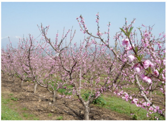 In recent years, a new training system, the Catalonian vase, obtained great success in Spain and then in different areas of peach and other stone fruit cultivation, whereby it led to a significant reduction in production costs, mostly for the reduced labor costs, achieved for the easier tree management [37]. This type of training system is fully managed from the ground, because trees present a low height; therefore, they do not need temporary or permanent supports. The branch number is not determined: it may vary from more open forms, consisting of four to five branches, to a denser shape, consisting of six to eight branches or even more [38,39,40].