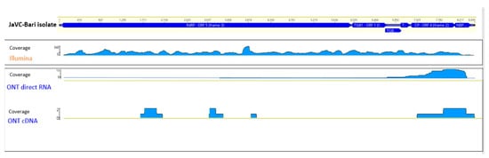 Genomic organization of JaVC. Distribution and respective coverage of the reads obtained from the three techniques along the genome of JaVC-Bari isolate.
