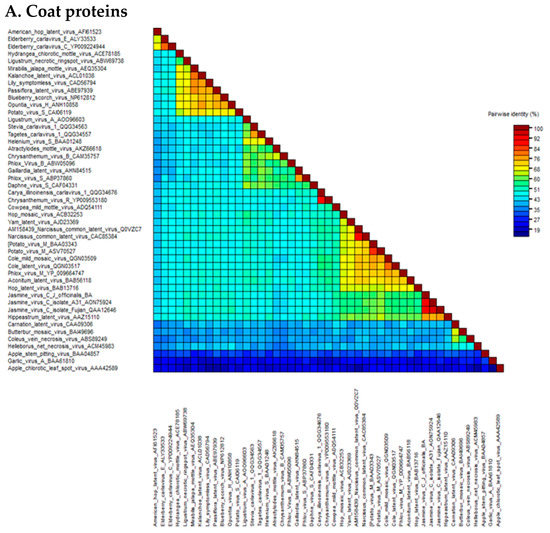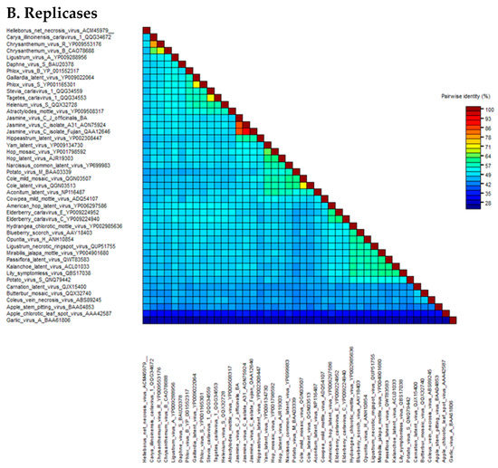 The pairwise matrix comparison of JaVC amino acidic sequences of the whole replicase and coat proteins was performed among the homologous sequences of carlaviruses and three outgroup flexivirid viruses (apple stem pitting virus, ASPV; garlic virus A, GaVA and apple chlorotic leaf spot virus, ACLSV) (all the viral protein sequences used in the study are listed in Supplementary Materials Table S2). In the CP gene, the range of similarity went from 41.7 to 42.7% for Helleborus net necrosis virus and American hop virus, up to 60.7% for potato virus M and 75.7% for Hippeastrum latent virus (Figure 2A; Supplementary Materials Table S3). For the replicase, calculated values were from a minimum of 43.9% for Coleus vein necrosis virus and carnation latent virus to 51.4, 51.6 and 57.4% for hop mosaic virus, yam latent virus and Hippeastrum latent virus, respectively (Figure 2B; Supplementary Materials Table S4).