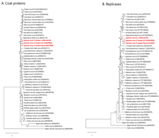 Maximum likelihood phylogenetic analysis of coat proteins (A) and ORF1 polyprotein (B) of the JaVC isolates (in red) versus other carlaviruses and outgroup flexivirids homolog proteins. GenBank accession numbers are on the tips (refer also to Supplementary Materials Table S2). Distance bar unit is under the dendrograms.