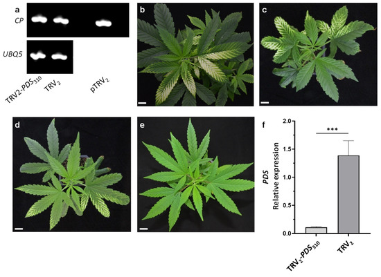 A comparison of different TRV2-PDS vectors inoculated using vacuum infiltration. (a) The detection of the viral coat protein (CP) transcripts by RT-PCR in the cannabis line MF-219 infiltrated with pTRV2-PDS310 or pTRV2, and on pTRV2 plasmid as a positive control. UBQ5 was used as a control gene. Cannabis plantlets inoculated with pTRV1- and pTRV2-PDS310 (b), pTRV2-PDS486 (c), pTRV2-PDS424 (d), or pTRV2 (e) 15 days after vacuum infiltration (scale bar = 2 cm). (f) A quantitative real-time PCR analysis of PDS transcript levels in cannabis leaves infected with TRV2 and TRV2-PDS310. The data were normalized to UBQ5 with the standard error indicated by vertical lines. The significant difference between treatments (p ≤ 0.0006; n ≥ 3; ***) was calculated using Student’s t test.
