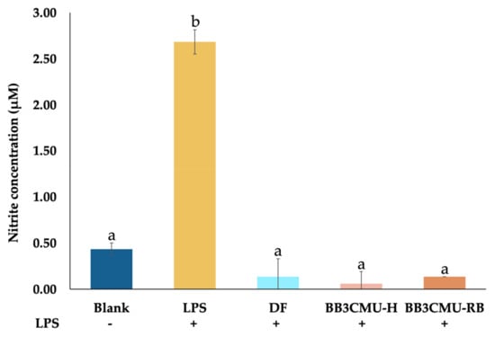 Effects of diclofenac sodium (DF), husk extract of Oryza sativa L. cv. Bue Bang 3 CMU (BB3CMU-H), bran extract of Oryza sativa L. cv. Bue Bang 3 CMU (BB3CMU-RB) at the equal concentration of 0.10 mg/mL on nitrite production in lipopolysaccharide (LPS)-stimulated RAW 264.7 murine macrophages for 24 h compared to vehicle-treated control without LPS (blank) and LPS-stimulated control (+LPS). Different letters indicate significant differences (p < 0.05): a and b indicate statistical significance in comparison to +LPS and DF, respectively.