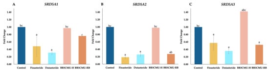 Many studies provided evidence that supports the hair-growth-promoting efficacy of herbal extracts and their bioactive compounds via the inhibition of 5α-reductase activity [9,56,57,58,59]. Only a few studied the downregulation of SRD5A expression, and reduction in the protein translation of 5α-reductase enzymes. DU-145 has been used as in vitro model to investigate the effects of substances on 5α-reductase activity and SRD5A expression [55,56,60,61,62]. Thus, this study evaluated the effect of BB3CMU-H and BB3CMU-RB on SRD5A1, SRD5A2, and SRD5A3 expression, as shown in Figure 2.