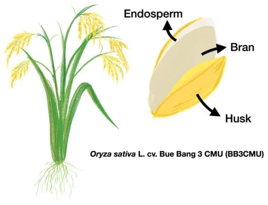 The rice bran and husk fractions of Oryza sativa L. cv. Bue Bang 3 CMU (BB3CMU) used in the study were obtained from Lanna Rice Research Center, Chiang Mai University, Chiang Mai, Thailand, in December 2020 (Figure 3). The voucher specimens of rice bran (PNPRDU63025) and rice husk (PNPRDU63026) were deposited in the Pharmaceutical and Natural Products Research and Development Unit, Faculty of Pharmacy, Chiang Mai University. Two kilograms of each fraction were macerated in 95% (v/v) ethanol (1:3, w/w) for 24 h. The extract solutions were double-filtered through Whatman filter paper no. 4 and no. 1 and then vacuum-evaporated at 50 °C by an evaporator (Hei-VAP value, Heidolph, Schwabach, Germany). Ethanolic extracts of rice bran and husk were labeled as BB3CMU-RB and BB3CMU-H, respectively. Samples were stored at 4 °C until analysis.