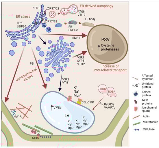 Schematic representation of the alterations observed in endomembrane trafficking and associated protein effectors during abiotic stress conditions. When facing adverse environmental conditions, plant cells’ response involves the de novo expression of several genes and proteins and an accumulation of reactive oxygen species (ROS) in several organelles or in the cytoplasm. The endoplasmic reticulum is affected by stress by inducing an ER stress response (bZIP17/28, NPR1, IRE1, bZIP60), activating genes responsible for the ER-unfolded protein response and inducing ER-derived autophagy (ATG8, VTI12). Unconventional routes, involving a Golgi bypass, are also activated during stress (PSI, RMR1, PS1 and PDF1.2), and the route to the protein storage vacuole seems to be enhanced when compared with the route to the lytic vacuole (upregulation of VSR1, SYP51 and VTI12 and downregulation of VSR2 and VTI11). The cytoskeleton adaptor proteins (Net1A) also seem to respond to stress, and a new role for microtubules in cell wall components’ deposition (CesA) may also be important. In the protein storage vacuole, an increase in proteases (like cysteine proteinases) has been documented along with an increase in vacuolar processing enzymes in the lytic vacuole. Ion channels/pumps for the translocation of K+, Na+ and Mg2+, located on the tonoplast, are activated in some stress conditions (K/Na pumps and CBL–CIPK), while the blockage of ROS translocation to the vacuole has been observed (RabG3e and VAMP7c). ER—Endoplasmic Reticulum; PSV—Protein Storage Vacuole; LV—Lytic Vacuole; PSI—Plant Specific Insert; ROS—Reactive Oxygen Species; VPEs—Vacuolar Processing Enzymes. Image created with BioRender.com, accessed on 9 January 2022.