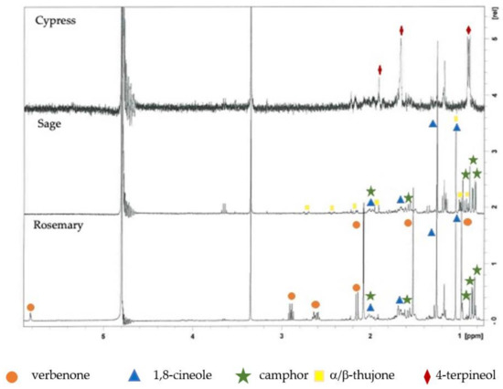 1H-NMR spectra of rosemary, sage, and cypress hydrolates.