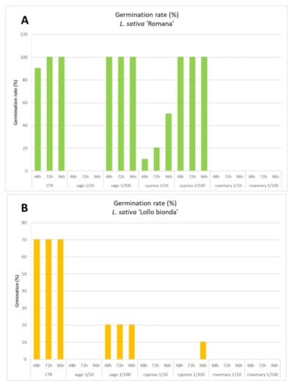 Commercial seeds of three lettuce varieties, namely Romana, Lollo Bionda, and Canasta, were selected for the test due to their fast germination rate and sensitivity. According to the method detailed in our previous paper [47], seeds were distributed on paper beds in a Petri capsule imbibed with diluted hydrosols (dilution [v/v] in distilled water 1/10 and 1/100). The emergence of at least 2 mm length with the typical geotropic curvature of the radicle was used as the criterium to define the presence/absence of germination. The seeds that showed false germination by soaking were not accounted for. The germination was recorded at 48, 72, and 96 h by counting the number of germinated seeds and were expressed as the mean value of at least triplicate experiments.