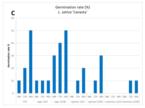 The effects of hydrosol dilution on the seed germination of three lettuce varieties are reported in Figure 3. The allelopathy test revealed intrinsic differences related to the physiology of the germination process, as well as sensitivity to the treatment between the different tested varieties. The variety Canasta was characterized by delayed germination; after 4 days, only half of the tested seeds showed emergent radicles while being less sensitive to the presence of hydrosols in the soaking solution. Only the rosemary hydrosol at the highest tested concentration completely inhibited the germination of the Canasta variety and other varieties as well. The germination of the Romana variety was inhibited by all hydrosols with 0% germination in the presence of sage or rosemary. Weaker inhibition was due to the presence of cypress that reduced the germination from 90–100% of the control to 10–50%. At higher dilution (1/100), sage and cypress lost their inhibitory effect (100% germination), while rosemary was still completely active (0%). The Lollo Bionda variety was the most sensitive to the presence of hydrosols, with complete or strong germination inhibition (germination range 0–20%), which was revealed for all tested samples at all dilutions. The hydrosol obtained from sage distillation was the most biocompatible, at least if applied diluted 100 fold, with no or partial effects on germination rate. Conversely, the rosemary hydrosol revealed a strong and broad spectrum of inhibitory effects on seed germination. These effects suggested cautions in the use of this extract without an appropriate dilution while remaining open to innovative strategies to investigate non-food applications, such as selective herbicides.